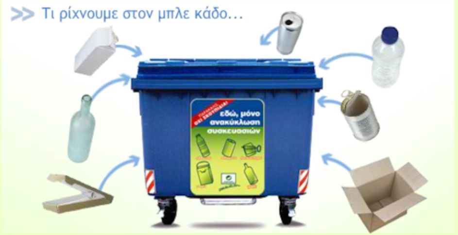 Παρατηρούμε συχνά ότι στους μπλε κάδους ανακύκλωσης πετιούνται διάφορα αντικείμενα που δεν θα έπρεπε να βρίσκονται εκεί. Οι μπλε κάδοι προορίζονται αποκλειστικά για συσκευασίες.